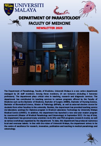 Faculty of Medicine, Department of Parasitology (2023) Newsletter 2023. Department of Parasitology, Faculty of Medicine, Universiti Malaya, Kuala Lumpur.